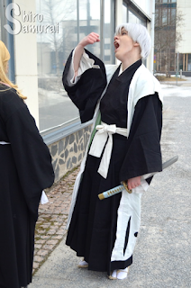 So yeah, I put on my Gin cosplay and soon enough our Bleach cosplay trio arrived at Kitacon. At the con we just walked around until Sairu-chan showed up, aka Rangiku Matsumoto and our final cosplay group member. With everyone together we went outside to have a photoshoot... and I can only sum it up by saying "ei siitä tullut helvettiäkään". :-DD